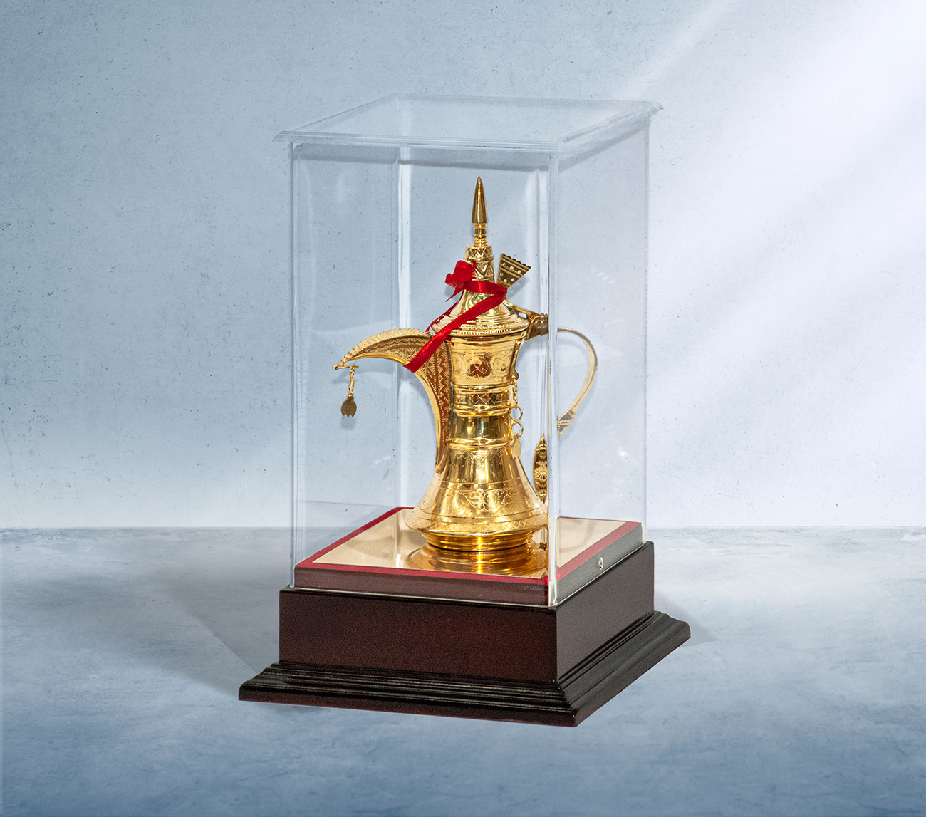 Gold plated Traditional Coffee Pot with wooden base and acrylic cover. H 23cm