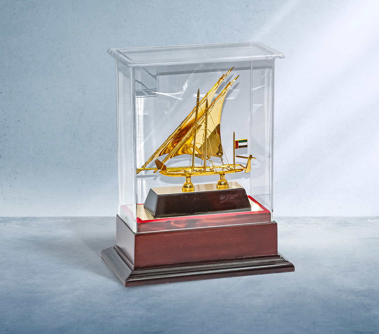 Gold plated Traditional Double Sail Dhow with wooden base and acrylic cover. H 28cm